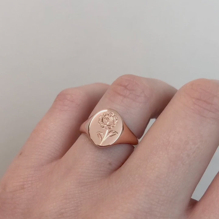 This solid rose gold signet ring features a hand engraved rose, on an oval shaped face.