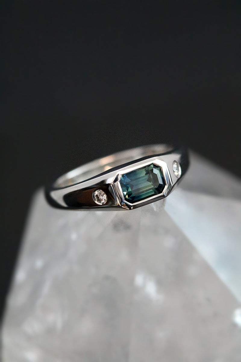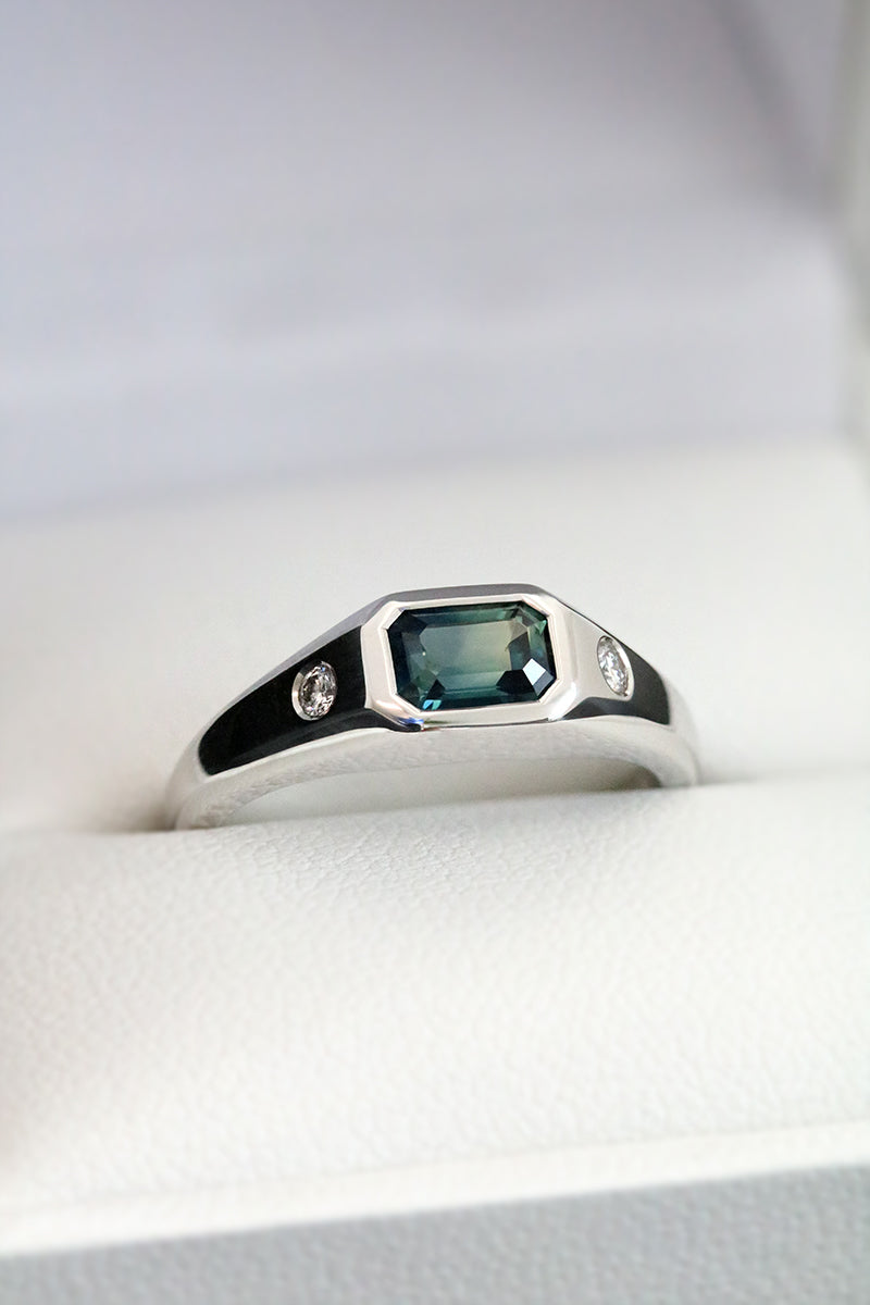 This white gold signet ring features a bezel-set emerald-cut Australian sapphire in an east-west orientation. Additionally, two flush-set diamonds adorn the shoulders of the ring. This stunning piece could be worn as an alternative engagement ring, or simply as a cherished everyday ring.