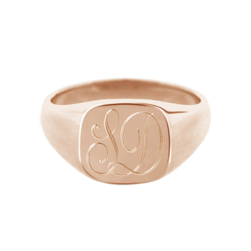 This solid rose gold signet style ring features a cushion shaped face and custom, hand engraved monogramming of your choice. Please send an email with the initials you would like, along with your order number. Between one and two initials usually looks best. For advice on what will suit this piece best, please email us!