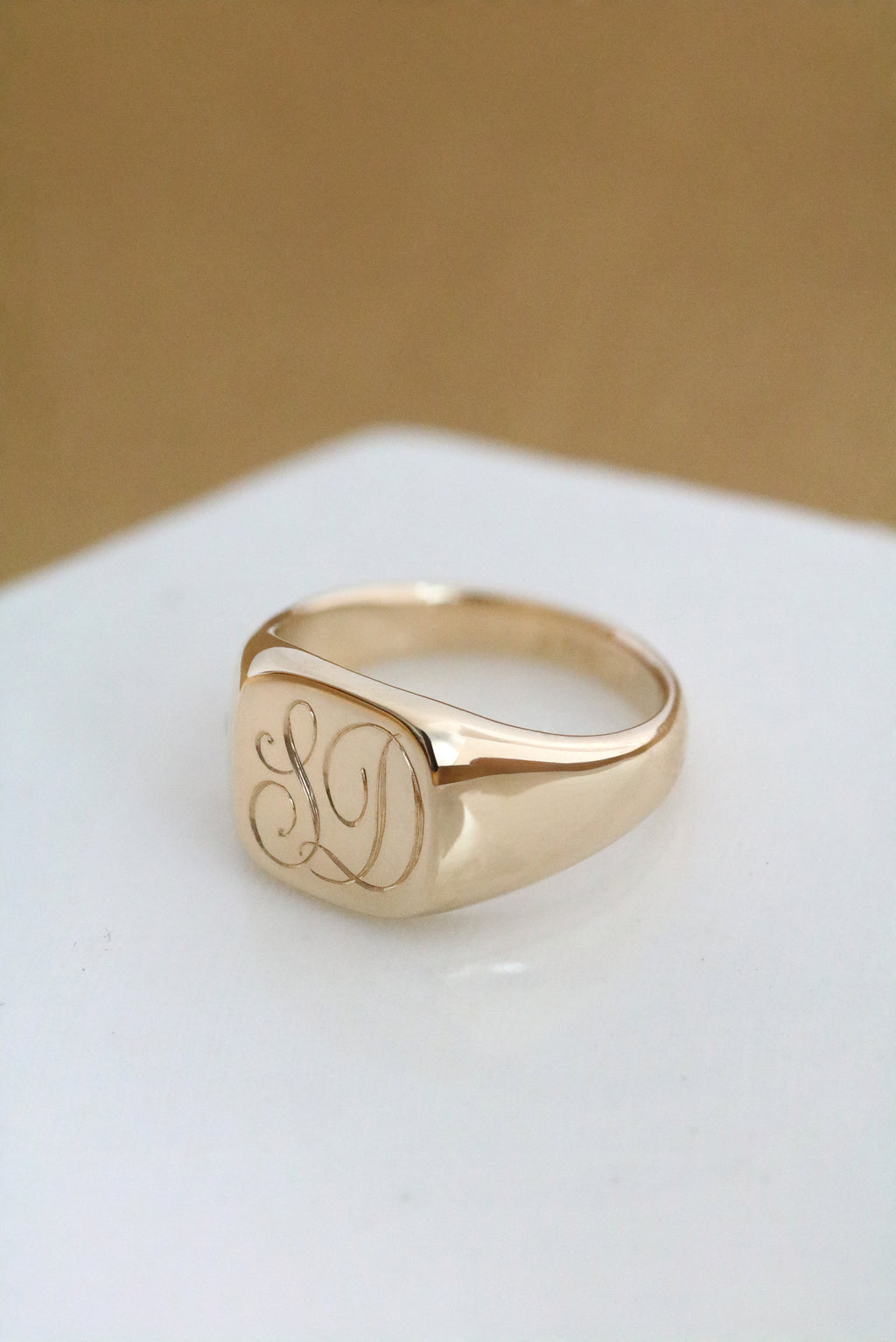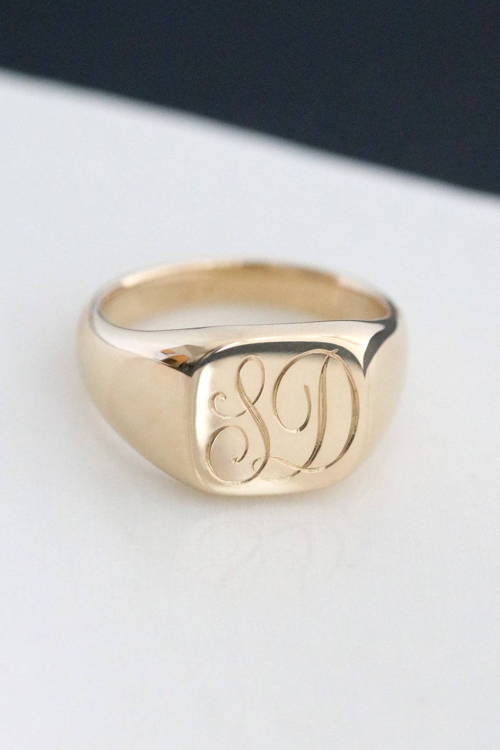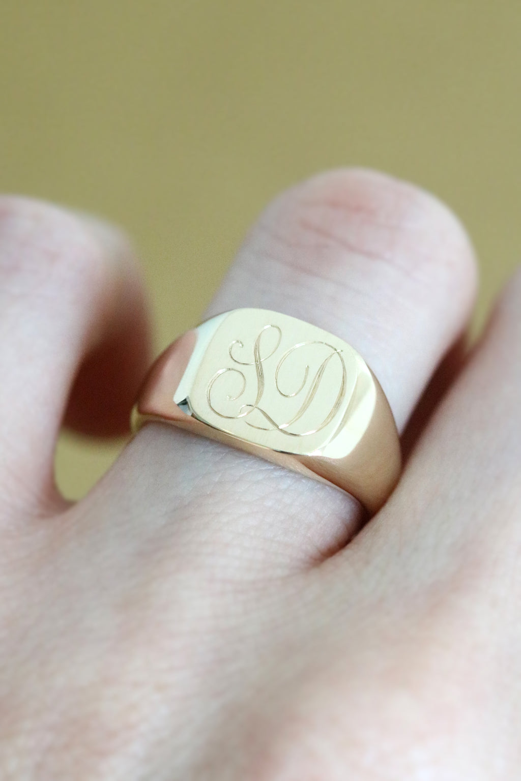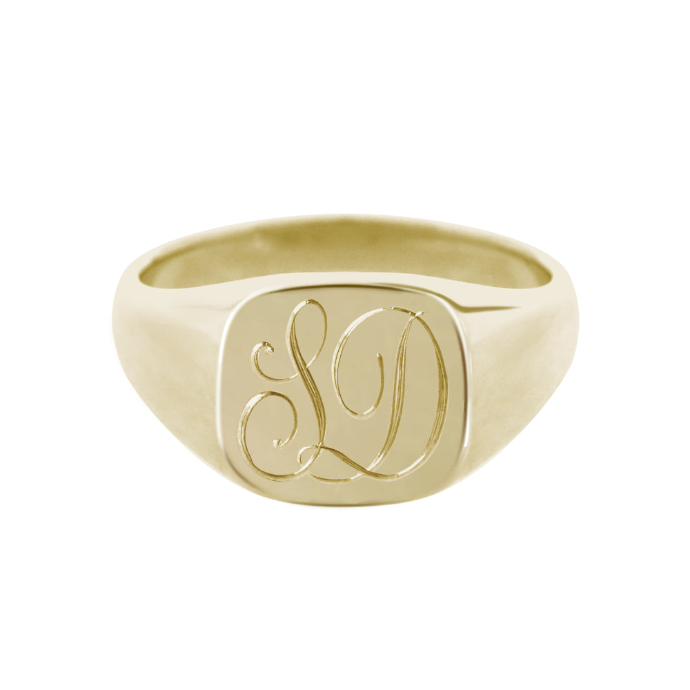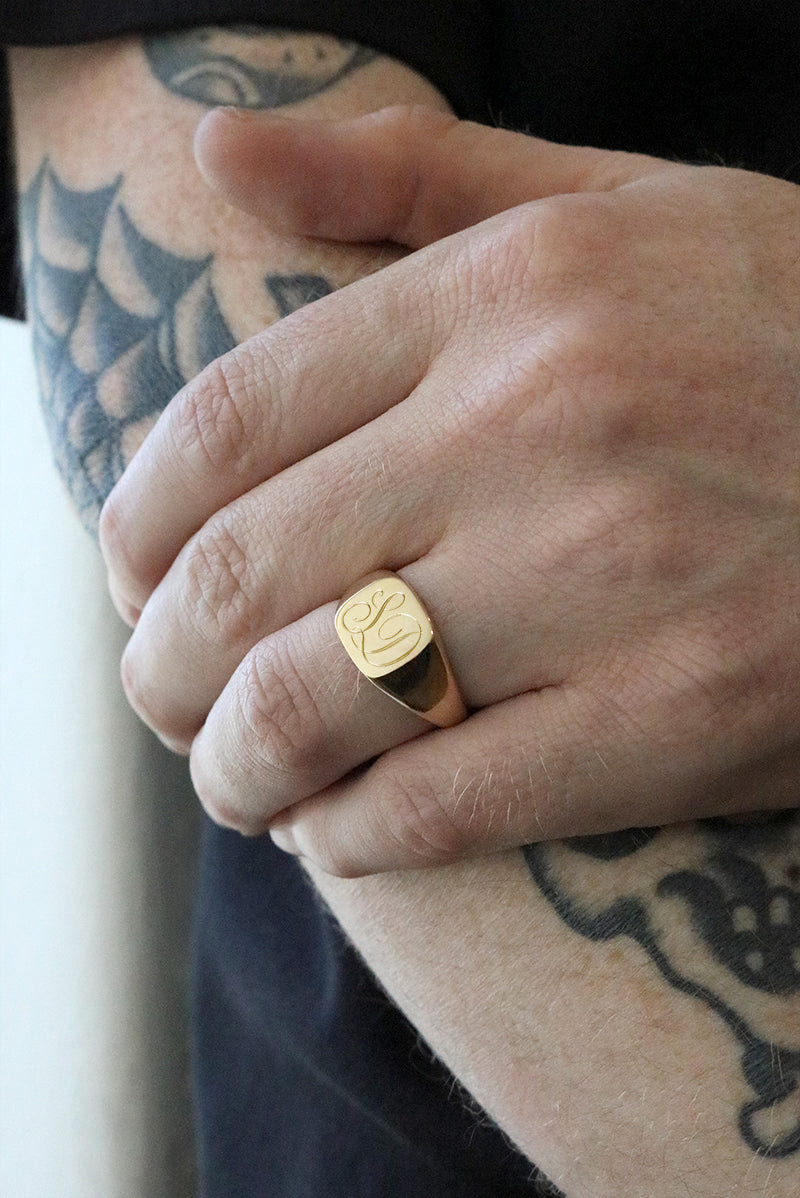 This solid yellow gold signet style ring features a cushion shaped face and custom, hand engraved monogramming of your choice. Please send an email with the initials you would like, along with your order number. Between one and two initials usually looks best. For advice on what will suit this piece best, please email us!