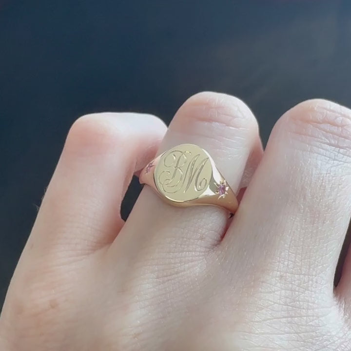 This solid yellow gold signet ring features customisable monogramming of your choice, with a star set pink sapphires either side. Please send an email with the initials you would like, along with your order number. Between one and two initials usually looks best.