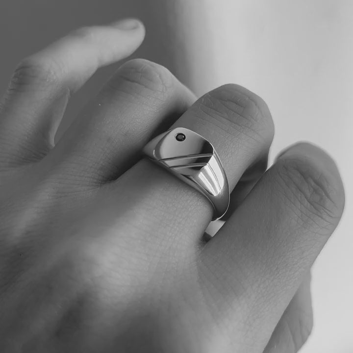 This solid white gold signet style ring features a cushion shaped face, with a flush set black diamond to one side with two hand engraved lines opposite. Suitable as a modern wedding band, as a symbol of commitment, or simply as a cherished piece of everyday jewellery, this ring is sure to be a favourite in your fine jewellery collection. This piece is genderless, and can be worn by anyone.
