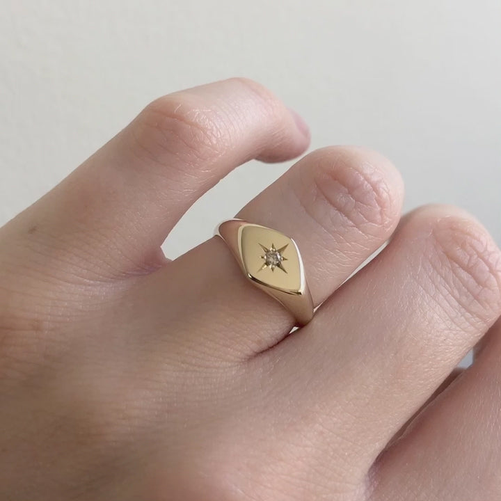 This solid gold signet ring features a diamond shaped face, with a 2mm champagne diamond in a star setting. Diamonds are C2-3 colour, SI1 clarity. The total carat weight is approximately 0.03ct.