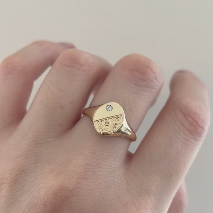 This solid yellow gold signet ring features scrollwork hand engraving, and a flush set diamond, and on an oval shaped face. The total diamond weight is 0.03ct, G SI1.