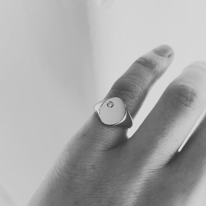 This solid white gold signet ring features a flush set diamond, and on an oval shaped face. The total diamond weight is 0.03ct, G SI1.