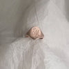 This solid rose gold signet ring features custom monogramming of your choice, on an oval shaped face. Please send an email with the initials you would like, along with your order number. Between one and three initials usually looks best. For advice on what will look best, please email us!