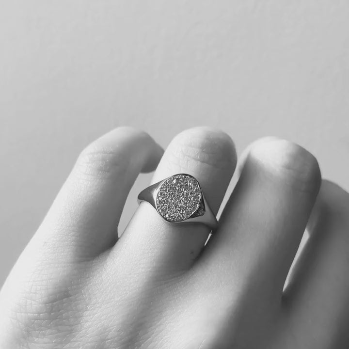 This solid rose gold signet ring is encrusted with sparkling round brilliant cut diamonds, which are pavé set all over the oval shaped face. This ultimate statement ring can be worn as a symbol of personal style, or even as an alternative engagement ring.
