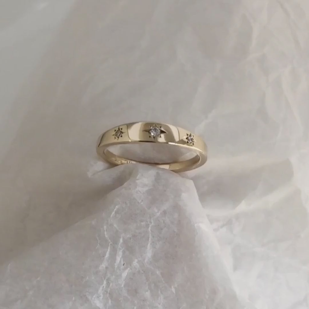 This solid yellow gold ring features three star set round brilliant cut diamonds, graduating from 0.03ct in the centre, to 0.01ct either side, with a total carat weight of 0.05ct. Diamonds are G colour, SI1 clarity.