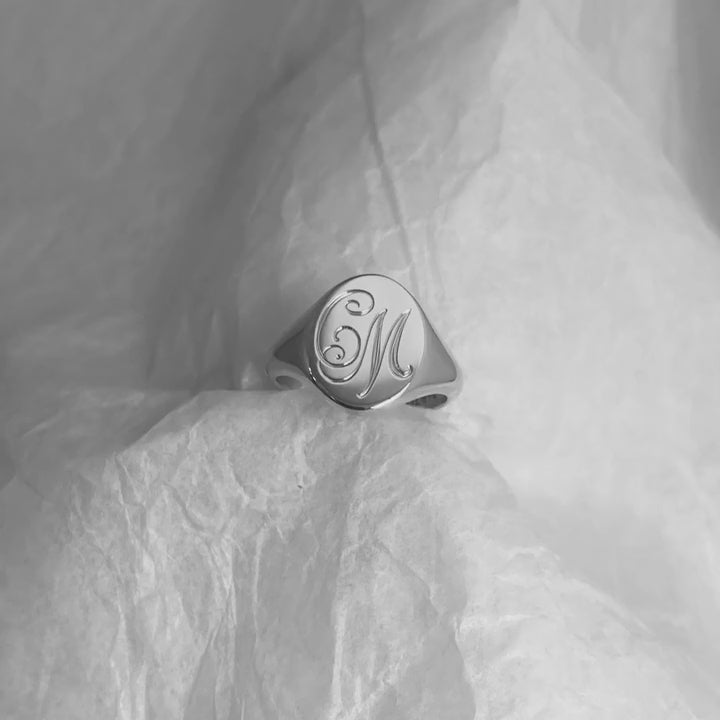 This solid white gold signet ring features custom monogramming of your choice, on an oval shaped face. Please send an email with the initials you would like, along with your order number. Between one and three initials usually looks best. For advice on what will look best, please email us!
