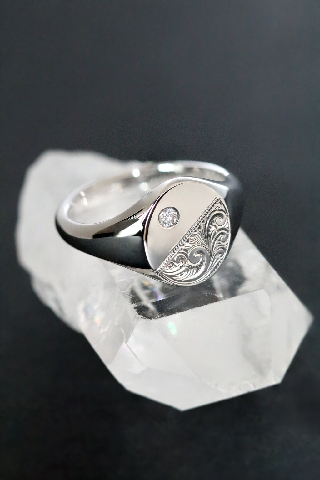 This solid white gold signet ring features scrollwork hand engraving, and a flush set diamond, and on an oval shaped face. The total diamond weight is 0.03ct, G SI1.