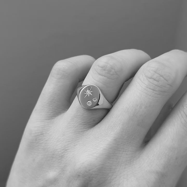 This solid yellow gold signet ring features a star set diamond alongside a flush set Emerald and yellow sapphire. It is possible to create this ring with any combination of gemstones you would like. For advice on what will look best, please email us. Gemstones are subject to availability.