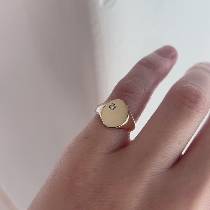 This solid yellow gold signet ring features a flush set diamond, and on an oval shaped face. The total diamond weight is 0.03ct, G SI1.
