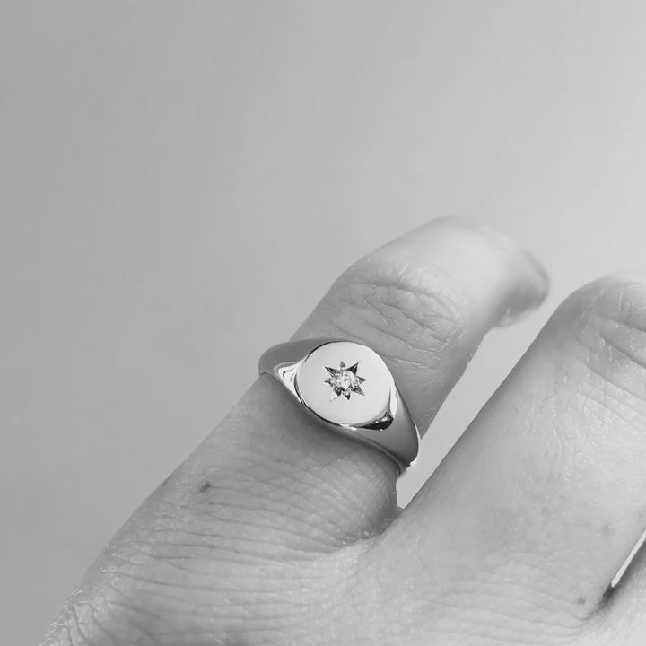 This solid gold signet ring features a circular shaped face with a 2mm round brilliant cut diamond star set in the centre, and tapers to fit comfortably on the finger. Diamonds are G colour, SI1 clarity.